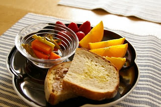 オレンジ・いちごと、ピーナツバターとオリーブオイルを塗ったカンパーニュで小洒落た昼食。