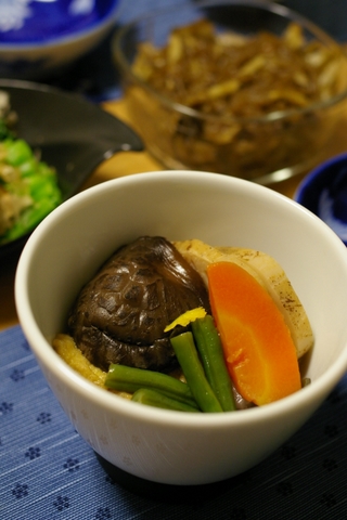 干しシイタケ・れんこん・ごぼう・にんじん・いんげん・薄揚げに、ゆずを散らしてお煮染め。