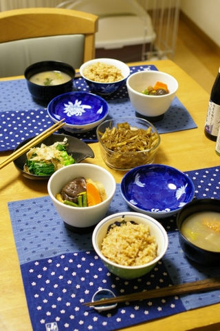 ごぼうと糸こんにゃくのきんぴら、小松菜のおひたし、白菜と厚揚げのおみそ汁・玄米ごはんと一緒に。