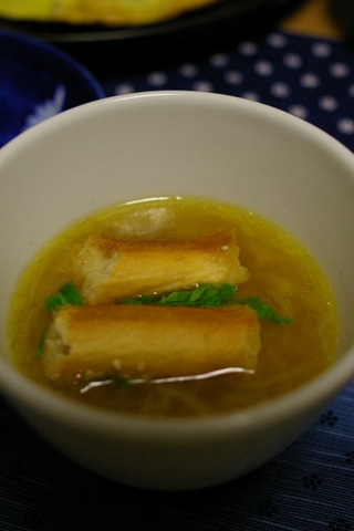 玉ねぎ2個を薄切りにし、オリーブオイルとバターを半量ずつ敷いたフライパンで炒める。玉ねぎが透き通ってくるまでは中強火で、その後はごくとろ火で時々かき混ぜながら、45分炒め続ける。飴色になった玉ねぎに水600ccを加え、ローリエ・塩・白こしょうを加えて一煮立ちさせる。あくを取ったらしばらく弱火でなじませ、浮き実にセロリの葉を刻んだもの、鳥飼リボリのパン(たまたま買ってあった)を散らしてできあがり。