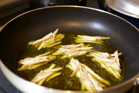 ごぼうがばさばさで味も香りもなかったので、飛騨の「ごぼうつかげ」を参考に、砂糖で甘くした衣をつけて揚げてみた。