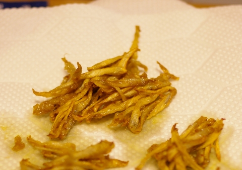 衣は、薄力粉大さじ2・きび砂糖小さじ2を水で溶いたが、もっと砂糖が多めでもよかった感じ。弱火でじっくりと揚げて水分を飛ばし、カリカリになるまで揚げる。
