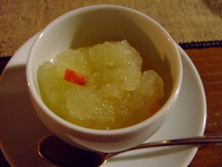 これはランチのメニュー。フレッシュジュースの次にアミューズ(山菜のジュレ)、デザートの前にグラニテとアントレ(グラタン)の追加されたディナーコース5,000円をオーダー。